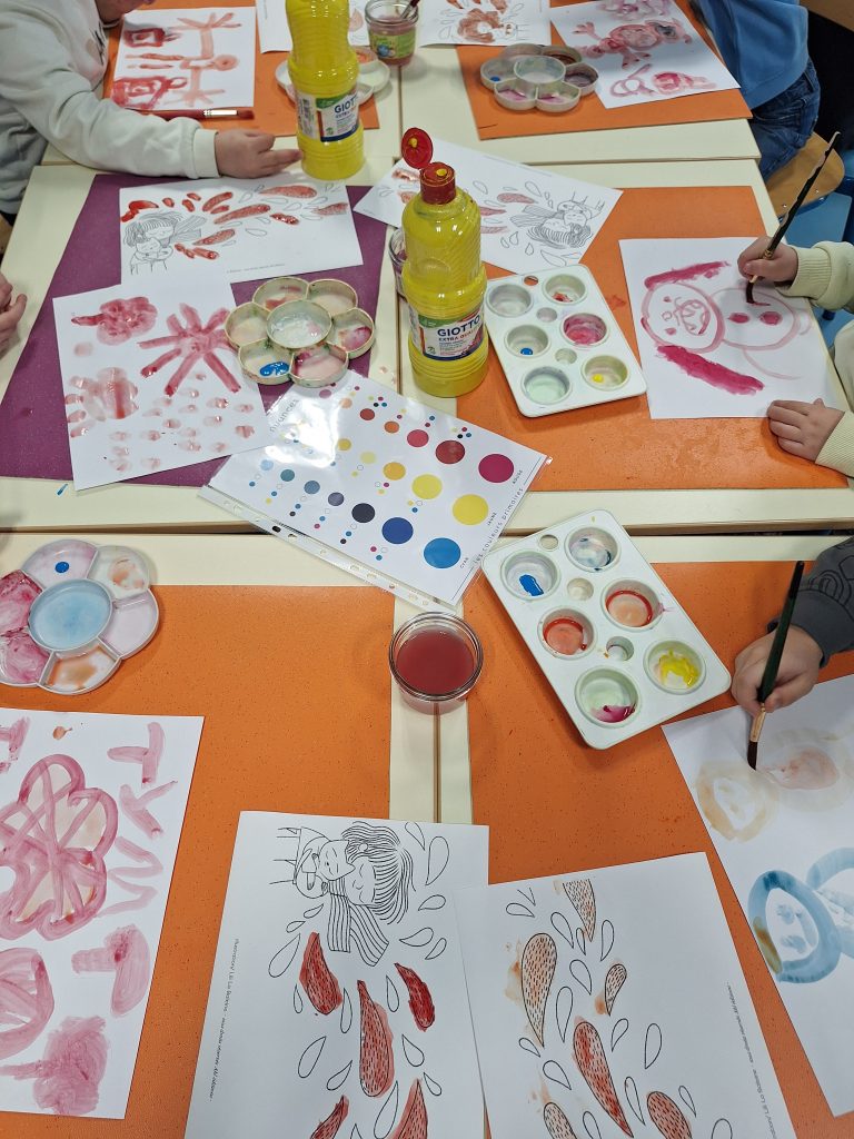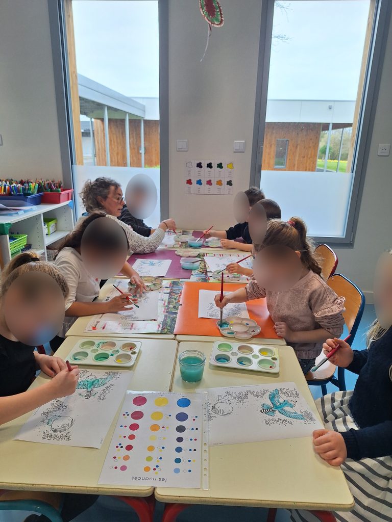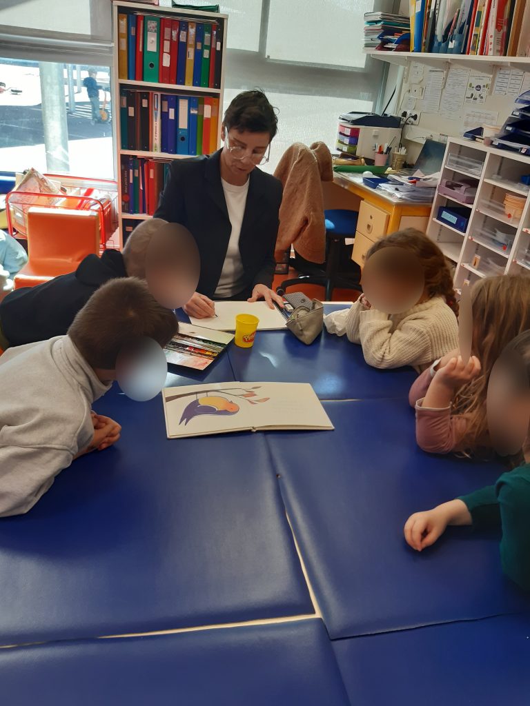 Les élèves de maternelle et de CP ont accueilli Agathe Hennig après avoir rencontré ses oeuvres avec leurs enseignantes. Elle a pu parler de son travail d’illustratrice et dessiner avec les élèves en leur expliquant la technique de l’aquarelle.